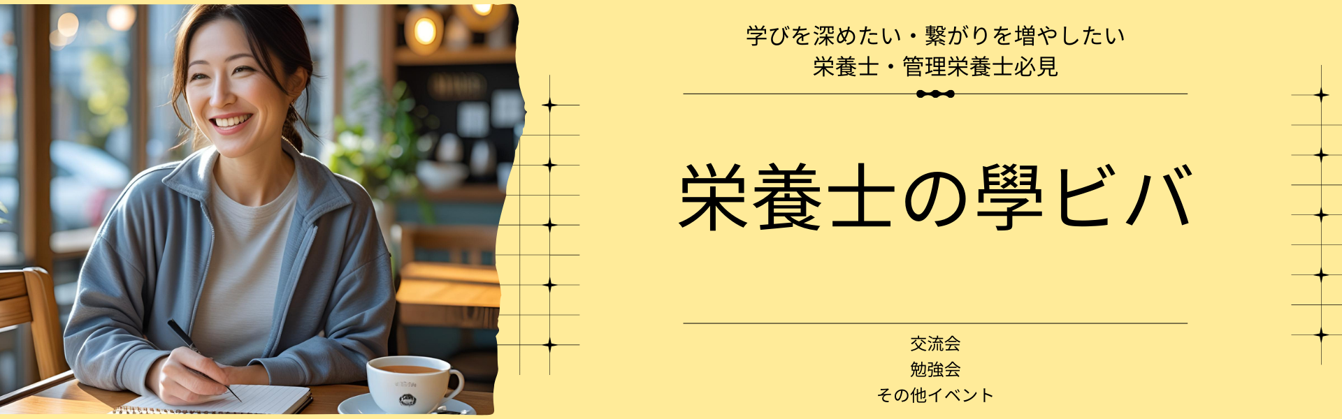 2019年から管理栄養士・栄養士向けの交流・学びの場を主宰。これまでに延べ約300名が登録・参加。2025年7月には「栄養士の學ビバ」としてリスタートし、交流×勉強会形式で新しい形のコミュニティを展開。独立やコラボ企画、副業案件獲得など、ら次なる1歩踏み出すきっかけに。